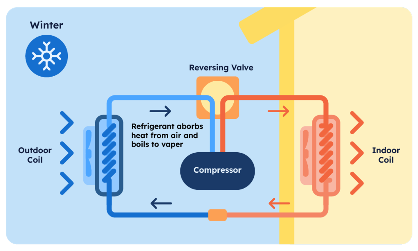Heat pumps transfer heat, using a refrigerant to absorb and release heat as it cycles between indoor and outdoor units. Here’s a breakdown of the steps of how a heat pump works: