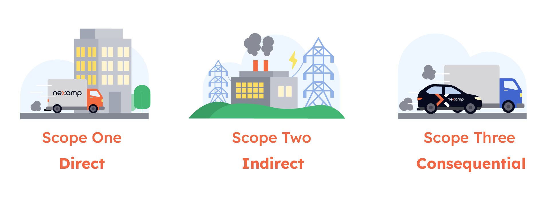 A carbon footprint is broken into three categories: direct (scope one), indirect (scope two), and consequential emissions (scope three).